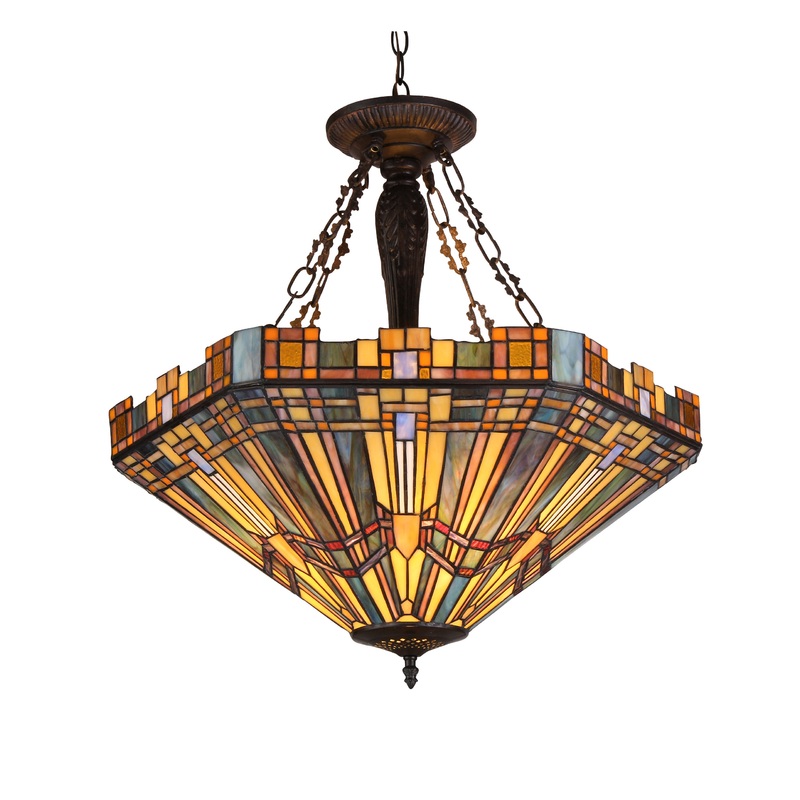SAXON, a Mission inverted hanging pendant lamp, will make a design statement all by itself. It can be the focal point of your home. Expand the effect by adding one or more of the other lamps in this style. Expertly handcrafted with top quality materials including real stained glass. Finished in an antique bronze patina.