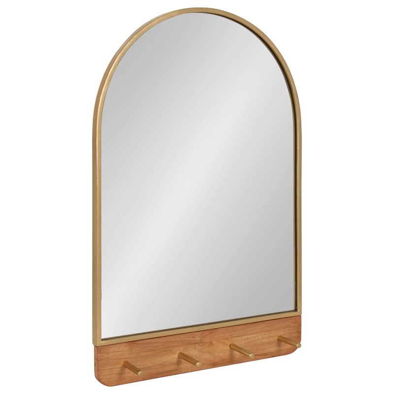 Enhance your cozy farmhouse home with the Schuyler mirror, a piece of wall decor that blends fashion and function within its robust design. This beautiful mirror features a two-tone natural wood and gold finish, creating a stylish look that fits into various color schemes throughout the home. The Schuyler is an arched mirror that features four wooden pegs. The metal frame is constructed from resilient iron, allowing it to last multiple years of high-quality display. This accent piece is fantastic for showcasing your unique style while highlighting your room’s natural light with its large reflective surface area. The overall display dimensions of the warm arch mirror are 20 inches wide by 4 inches deep by 31 inches tall, creating a commanding presence that draws attention and captivates onlookers. Use this timeless wall hanging mirror as a decorative focal point for your wall decor display or enhance your vanity as a bathroom mirror with storage. Use the metal keyhole hangers attached to the back to hang this mirror in your living room, bedroom, bathroom, or entryway.