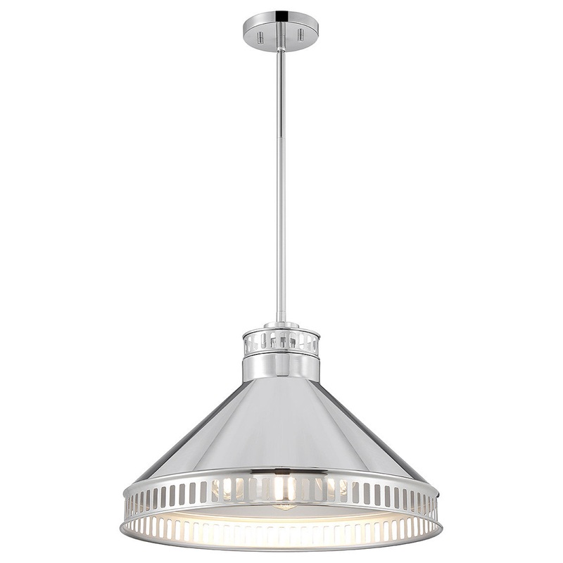 Laser-cut detailing on the metal shade of this Savoy House Seagram 3-light pendant brings a thoughtful touch of intrigue to this industrial look. Finished in polished nickel. Seagram is 20″ in width and has an adjustable height ranging from 14″ to 68″. Comes with four 12″ downrods and one 6″ downrod. It uses 3 standard size bulbs of up to 60 watts per bulb (bulbs not included).