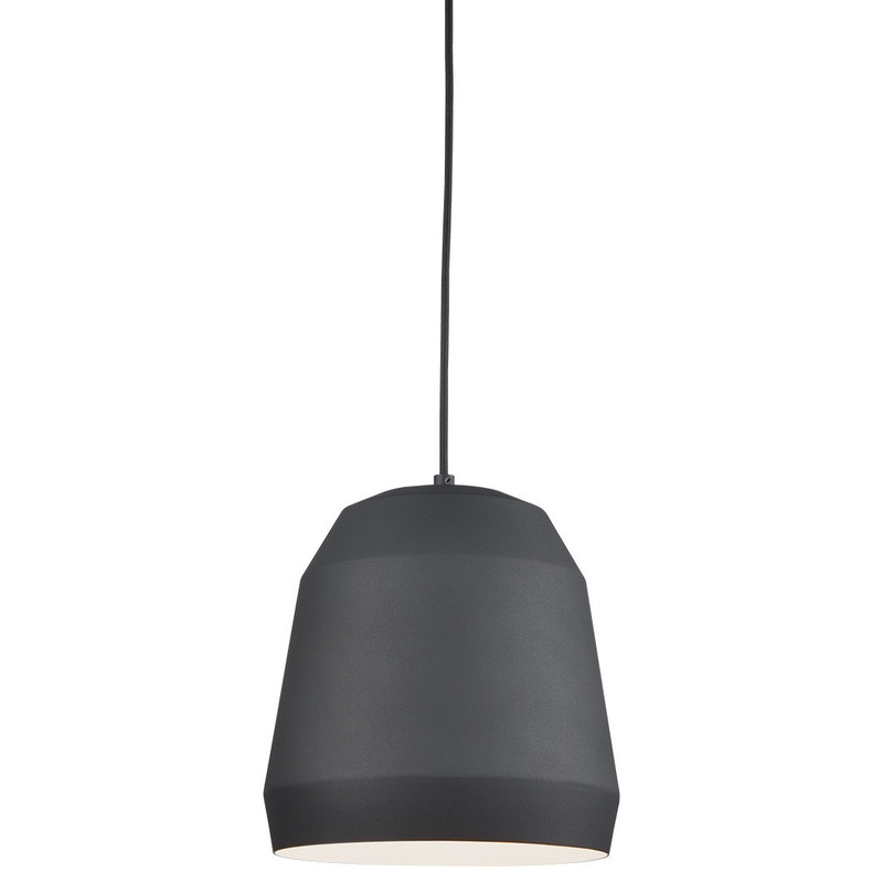 PENDANTS -Single lamp pendant with faceted aluminum shade showcasing powder-coated finishes against a matte white interior. Exterior shade colors are black, blue, white or gray. Suspended by cloth cable to a maximum 120" length. Available in 2 sizes. -Bulb