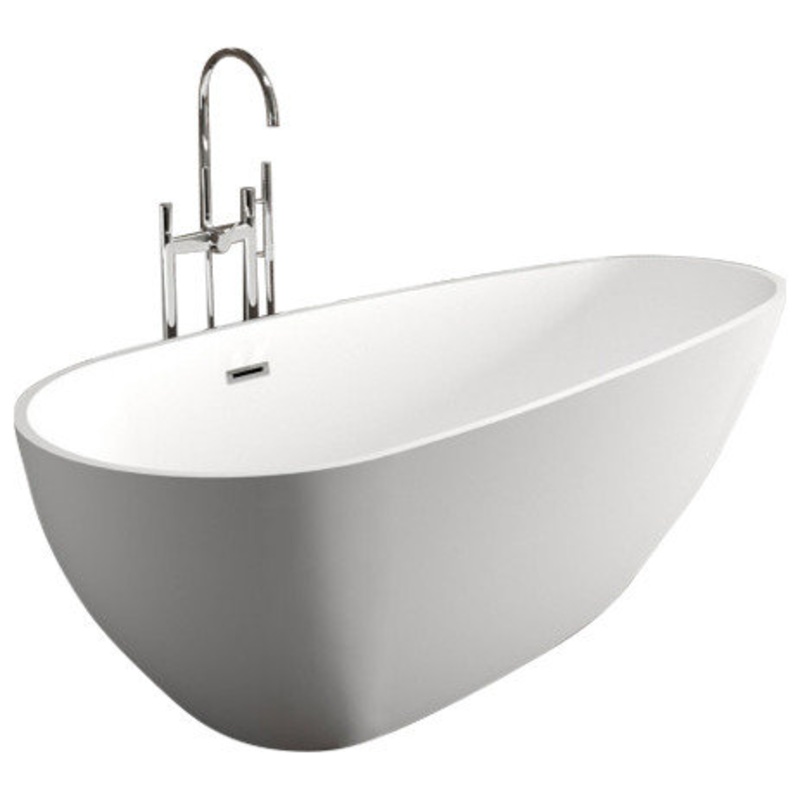 Freestanding 55″ long by 28″ wide oval-shaped soaking tub with a 53 gallon capacity. Made with durable acrylic and available in white. Drain not included.