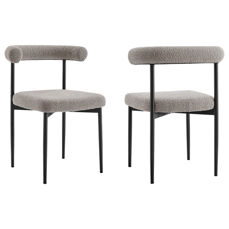 Shannon Upholstered Dining Chair with Metal LegsBring effortless style and comfort to your home with our Shannon Dining Chair in Fabric and Metal – Set of 2 by Armen Living. This contemporary dining chair makes a sophisticated statement with its chic and refined style. A cylindrical cushion complements the curved backrest to offer perfect back support. The chair includes a generously padded seat, to provide a comfortable seating experience. It is covered in performance fabric to offer easy care and maintenance. Featuring a sleek and slender metallic frame, this dining chair lends effortless elegance to any corner. It can bring everyday charm to your eat-in kitchen and dining room. The Shannon chair can offer an easy-to-land spot anywhere from your living space to your home office. Its sturdy and durable construction allows years of use. Available as a perfect pair, the Shannon Dining Chair comes in brushed stainless steel with: Light Gray, Charcoal, Blue, or Taupe Fabric or matte black iron with: Thundercloud Gray fabric, Black fabric, Cream fabric, or Light Gray faux leather to effortlessly blend and complement your existing style and decor.