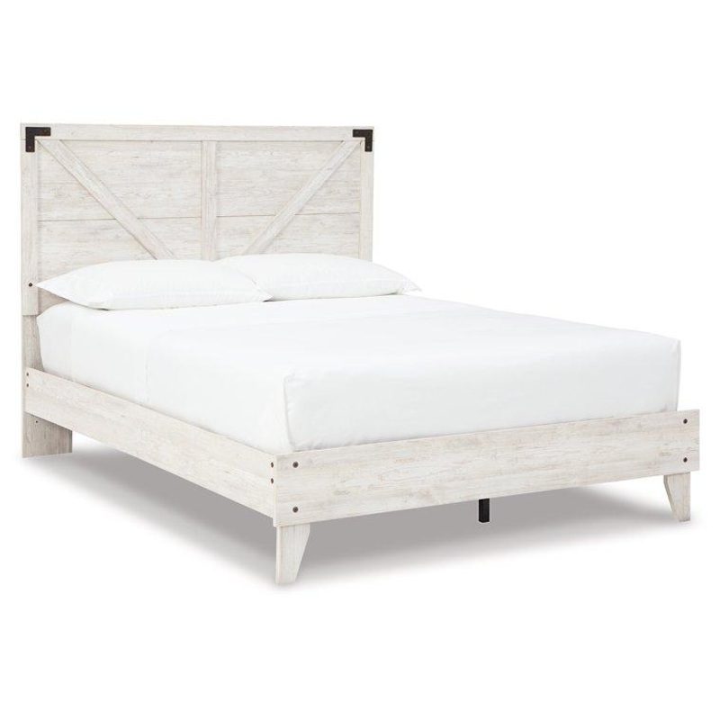 Give provincial a new meaning with the chic look of this queen crossbuck panel platform bed. The worn whitewash distressed finish keeps this piece light and fresh while the warm pewter-tone hardware adds an industrial touch. The panel headboard with crossbuck detail adds a delightfully homespun charm to your space. Best of all, our innovative bed-in-a-box shipping system delivers your new bed right to the door.