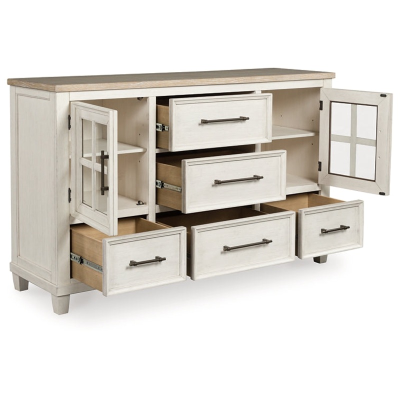This dresser elevates the art of modern farmhouse design. Its two-tone aesthetic blends antiqued white and light grayish brown for a charming finish. Framed drawer fronts and windowpane cabinets lend a country feel. Conveying a feeling of relaxed comfort, the dresser is sure to carry you away to a dreamy time and place.