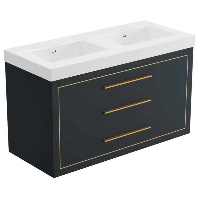 Our floating bathroom vanity set is a minimalist design with clean lines and an elegant trim of chrome or brass (for white and charcoal color options; olive is available with only chrome trim). Each set consists of a vanity base and basin (with one faucet hole per sink, faucets not included). These 48″ sets are available with a double sink resin basin. Its space-saving wall-mounted design adds a feeling of spaciousness to any bathroom space. Equipped with two soft-closing drawers, it offers ample storage for all your essentials while maintaining an uncluttered appearance. Constructed from high-quality materials, this simple yet stylish vanity is durable and sophisticated. Elevate your bathroom’s aesthetics and practicality with this exceptional floating vanity. Set includes vanity base and basin only.