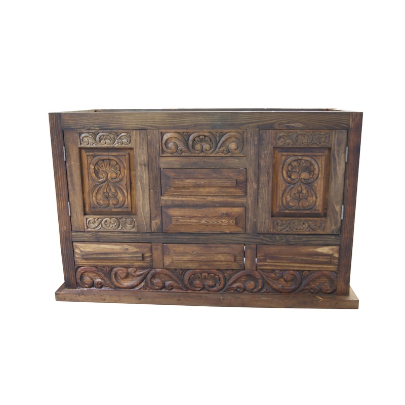 Shipwreck is a beautiful carved wood vanity hand crafted from 100% barn wood from Mexico. This vanity gets its name from a beautiful paint color called Shipwrecked. The wood is hand rubbed with paste wax. The top if any,has been sealed to protect the wood from water damage. The vanity is hand carved to give it that old and luxury style.