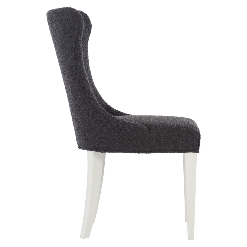 Silhouette is defined by bold geometry, soft curves and a hint of Hollywood Regency glamour. The Silhouette side chair abounds with delightful touches: a button-tufted hourglass back, cozy dark boucle upholstery, and back sabre legs contrasting with gently tapered legs in the front. This balanced piece expresses an understated extravagance.