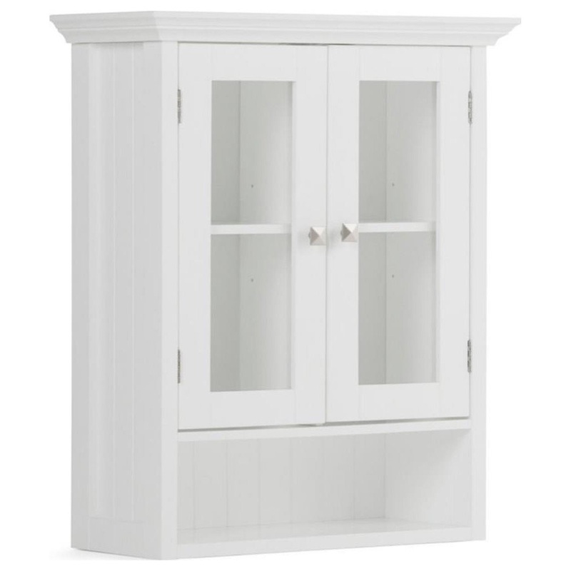 Keep all of your bathroom essentials neat and orderly with the Simpli Home Acadian Double Door Wall Cabinet. Two tempered glass doors help keep clutter out of sight, while an open shelf provides ample room for toiletries and other items. Adjustable shelving inside the cabinet allows you to customize the space to suit your needs. Its Pure White finish will easily coordinate with existing bathroom dcor.