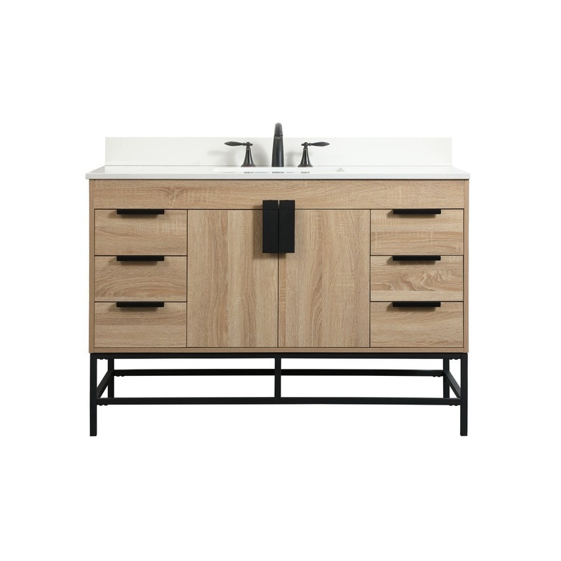 This vanity is a sleek-looking piece of bathroom furniture that is easy to incorporate into your design scheme. The cabinet features a smooth door panel with an oversized steel handle and soft close hinges provide ample room for accessories. Packed with multiple side drawers with soft close glides for added comfort and full access to bath supplies. Constructed of engineered wood, the powder-coated metal rod legs are an urban industrial look that we love. Minor assembly of the metal legs needed to get this vanity up and running. Comes with a matching backsplash to complete the look and protects your wall. Comes with a matching backsplash to complete the look and protects your wall.