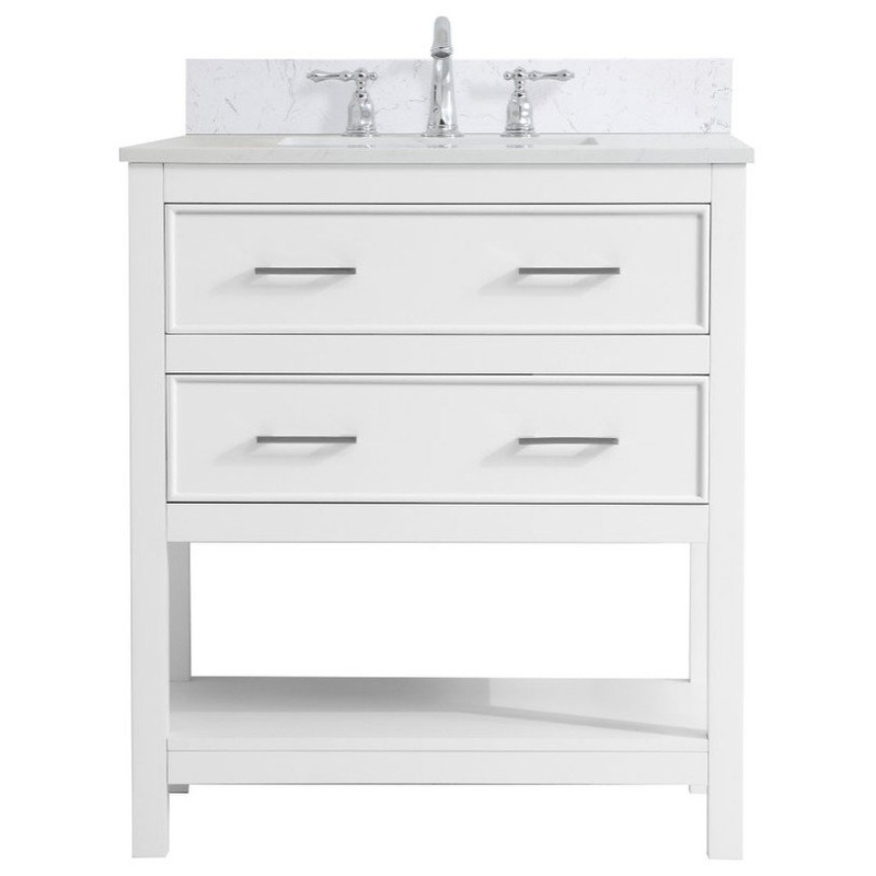 Make the most of your space with this 30" traditional style bathroom vanity. Its traditional style is able to complement many aesthetics with its white finish, Engineered Marble countertop, and the contemporary slender brushed nickel handle bar that sits o