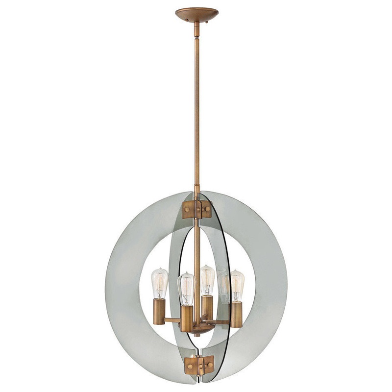 The contemporary, stem hung design of Solstice creates an intersecting transparent sphere with semi-circular glass panels brought together by bold metal hinges. Available in Smoked Glass and Heritage Brass or in Clear Glass with Polished Chrome. -Type of B