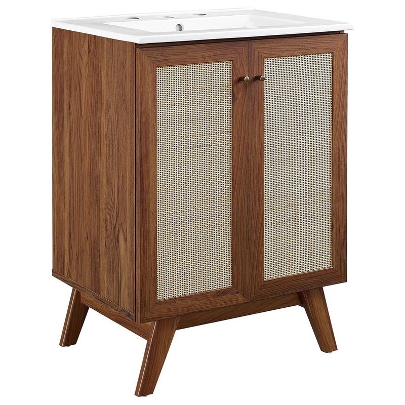 Introduce refreshing style to your restroom with the Soma 24″ Bathroom Vanity. Showcasing a beautiful rattan weave on the cupboard doors, this vanity brings organic aesthetics and modern functionality to any bathroom or powder room. Crafted from durable MDF and particleboard with a natural wood grain finish, this vanity boasts a ceramic sink basin with 8-inch centerset holes and an integrated countertop. This vanity features an adjustable shelf, providing easy customization for arranging towels, toiletries, and bathroom necessities. Complete with metal doorknobs with a brushed gold finish and soft-close hinges, this bathroom vanity cabinet is designed for quiet and effortless functionality. Resting on splayed legs, the Soma Bathroom Vanity includes non-marking foot caps to protect flooring. Assembly required. Fixtures not included.