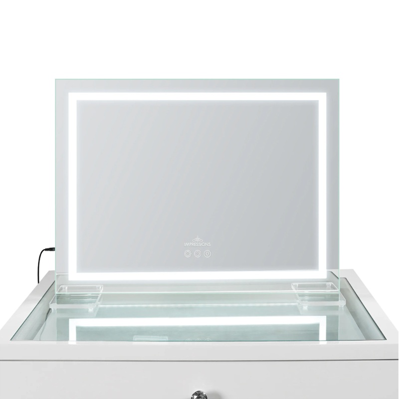 Impressions Vanity presents the Stage Lite Plus LED Makeup mirror for a professional makeup experience. Its elegant design makes it a must-have for every makeup enthusiast. This crystal-clear mirror for vanity offers a magnificently detailed view, ensuring flawless makeup application every time. The ultra-slim and lightweight design makes it versatile for any space, featuring a removable acrylic table stand for your desk and built-in wall anchors for a space-saving wall-mounted option. Cleaning is a breeze with a simple wipe down, maintaining the tabletop mirror’s pristine clarity. Illuminate your beauty space with the Stage Lite Pro’s mesmerizing LED strip lights, providing professional makeup studio lighting. Control our lighted mirror brightness effortlessly with the soft-touch sensor screen. With perfect ambiance, achieve the perfect detailing during your skincare routine. Experience the versatility of three color temperatures Cool White, Natural, and Warm to find the ideal lighting ambiance for your desired makeup style. Whether you’re a makeup artist or a beauty enthusiast, our vanity light up mirror is the ultimate companion for achieving perfection in your daily beauty rituals. Upgrade your makeup station with this light up vanity mirror, and let your beauty shine in the best light possible.