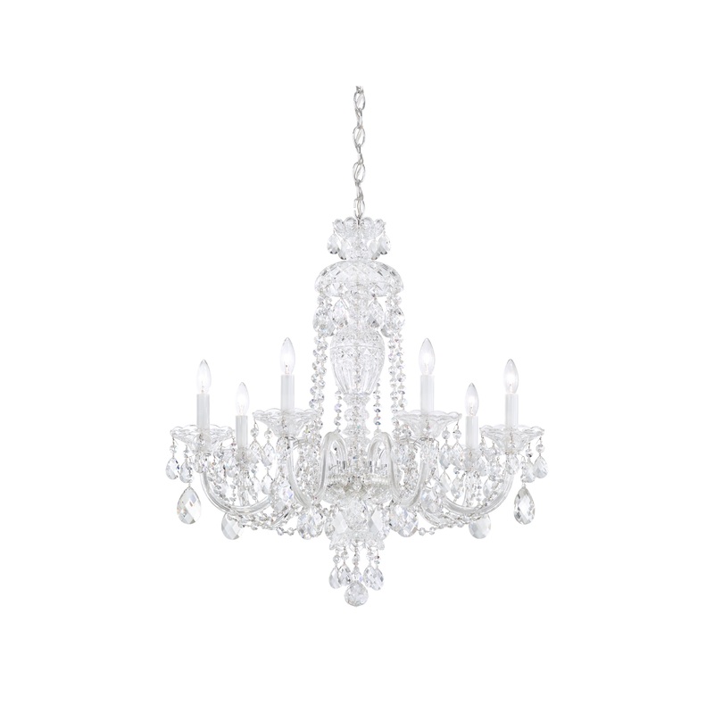-Lamping: 7 B10 60 WattIn the eighteenth century advances in glassmaking techniques and the demands of rich patrons made all-glass chandeliers the ultimate statement of class. Sterling, an all-crystal chandelier with hand-formed crystal arms and finely cut pendants, column and dishes, is the ultimate illustration of historical chandeliers’ dazzling by light.’