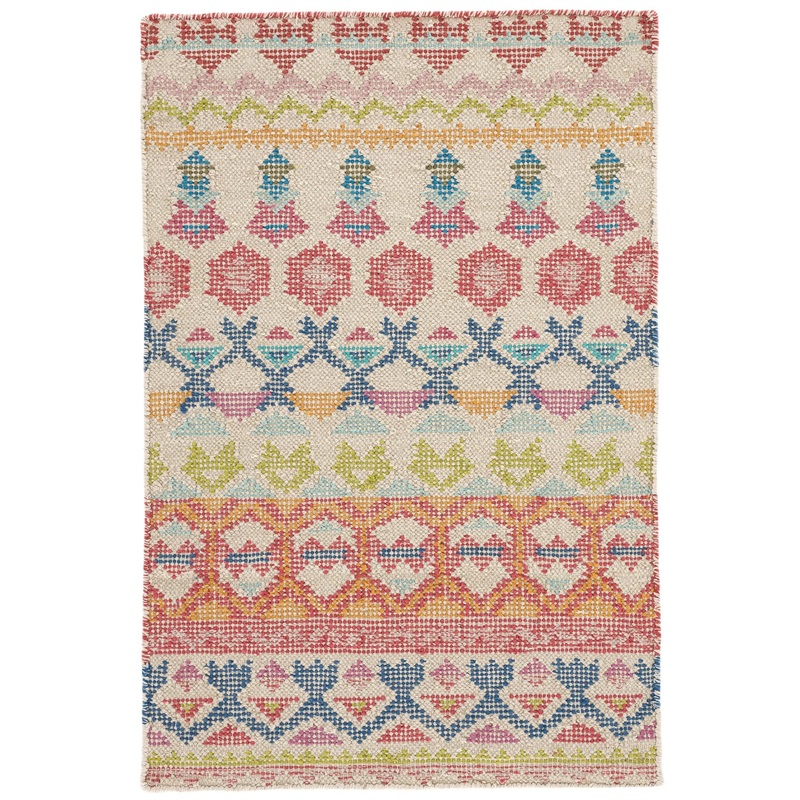 Loom knotted cotton flatweave rug features unique and pretty Fairisle motifs woven in a Birdseye technique, which beautifully mutes and washes down the lively palette of Orange, Leaf, Denim, Fuchsia, Red and Soft Pink. Enhanced durability is an added bonus delivered by its special woven structure.