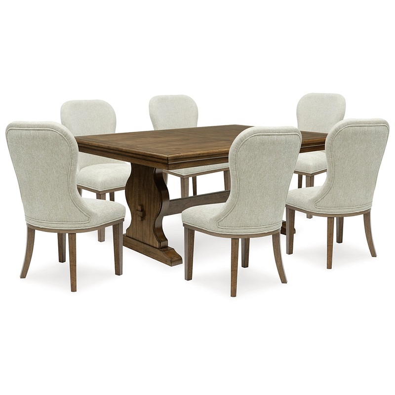 Traditional style doesnt have to be stuffy. It can feel warm, inviting and beautifully in the moment. Case in point: this dining set. Merging the versatility of an extension table with the comfort of sumptuously upholstered chairs, it has an allure all its own. Equally special is the rich brown finish, which exudes a mood of timeless charm. How’s that for relaxed refinement?
