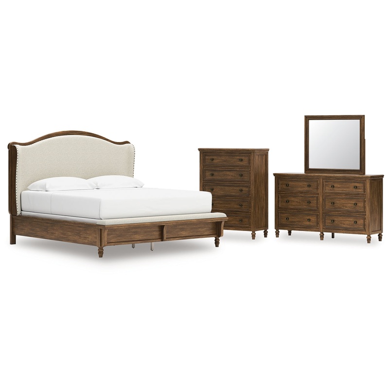 | Details | B787B4: Includes upholstered headboard, panel rails and bench footboard with slats, Made with hardwood solids, veneers and MDF substrates, Brown finish, Polyester upholstery, Nailhead trim, Turned feet, Foundation/box spring required, sold separately, Mattress available, sold separately, Assembly required, B787B1: Includes dresser and mirror, Made with hardwood solids, veneers and MDF substrates, Brown finish, Oil-rubbed bronze-tone knobs, 6 drawers with fully finished interior, dovetail construction and heavy duty ball-bearing side glides (top drawers felt lined), Turned feet, Mirror attaches to back of dresser, B787-46: Made with hardwood solids, veneers and MDF substrates, Brown finish, Oil-rubbed bronze-tone knobs, 5 drawers with fully finished interior, dovetail construction and heavy duty ball-bearing side glides (top drawer felt lined), Turned feet, |