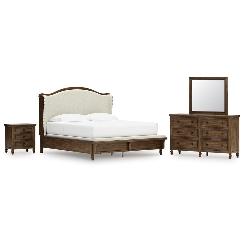 Sturlayne King Upholstered Panel Bed with Mirrored Dresser and Nightstand
