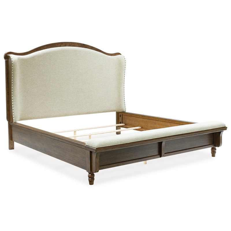 Traditional style doesnt have to be stuffy. It can feel warm, inviting and beautifully in the moment. Case in point: this queen upholstered panel bed. The alluring piece features a distinctive headboard with a shelter wing design. Its cushioned bench footb