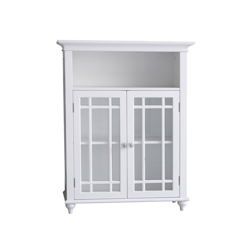 Teamson Home’s Neal Freestanding Two-Door Floor Cabinet in a clean, white finish features cabinet doors with glass panels under a prairie-style grid. This decorative storage cabinet includes an interior adjustable shelf to organize items to keep spaces clutter-free. Above the cabinet, an open fixed shelf adds convenient easy access to items or as a space to display knick-knacks or tchotchkes. Magnetic latches operate silently, eliminating clicking or slamming noises, and keeping doors shut.