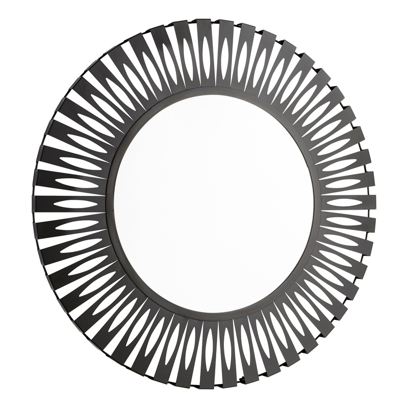 This decorative wall mirror features a modern metal frame in a round graphite finish. The iron metal has accented tabs that are arranged side by side into one large circle with the reflective glass centered perfectly to provide absolute symmetry. This gorg