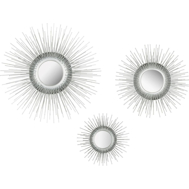 Wispy rays of gold-finished iron evoking porcupine needles are artfully arranged to create the dramatic effect of the Sunburst triptych mirror set. Made for display as a set of three, these transitional sunbursts make a graphic wall art statement. Product