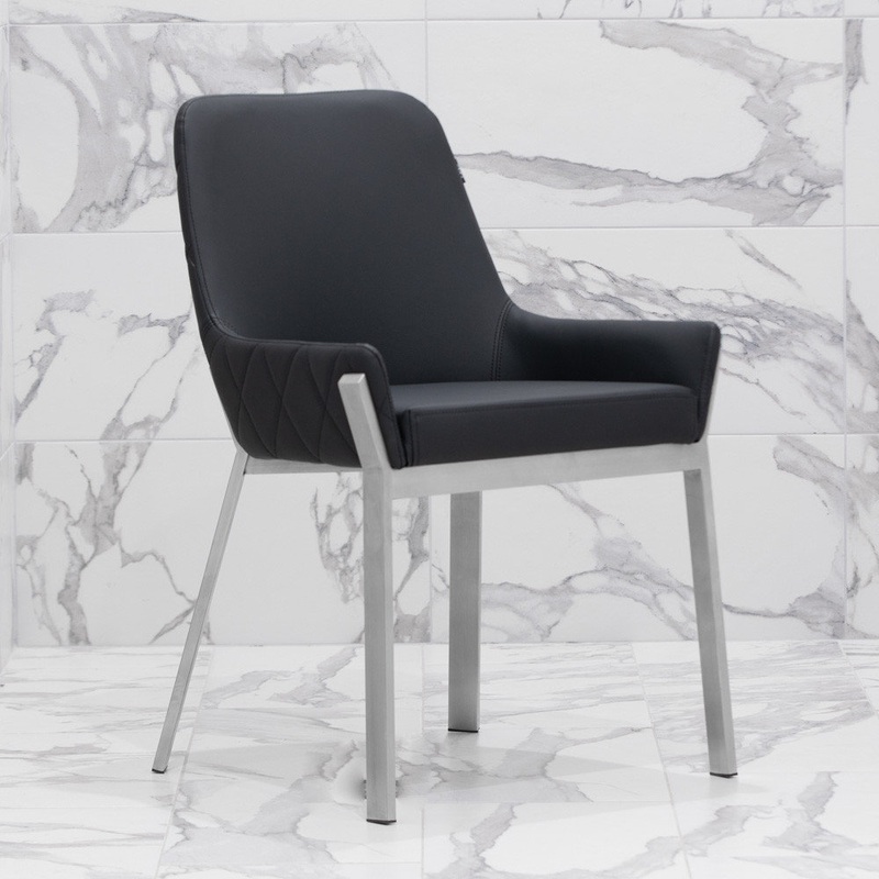 The Sydney Dining Chair is a fine example of transitional elegance, combining traditional elements and a modernist style within one stunning furniture piece. It comes upholstered in your choice of subtly pebbled black, white, gray, or brown leatherette material, with a tufted pattern that wraps around the wide backrest. Slanted, brushed stainless steel legs cradle the padded seat and arm support. Just the right amount of luxurious and contemporary, the Sydney Dining Chair is an excellent addition to any dining space.