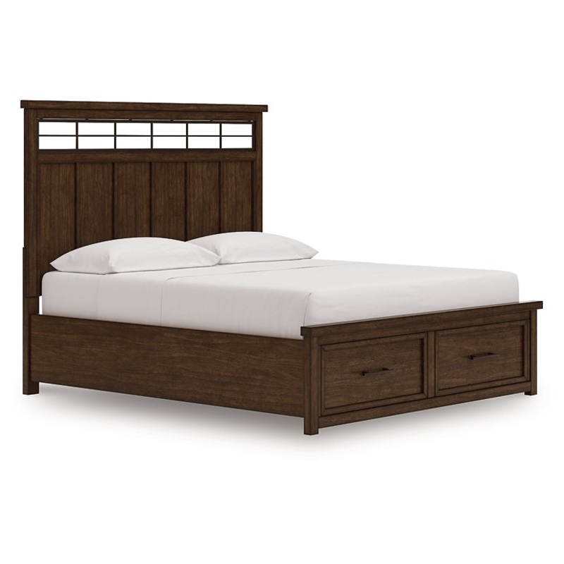 Style, simplicity and charm are hallmarks of this California king panel storage bed. Created with casual spaces in mind, it has the versatility to suit styles from craftsman to modern farmhouse. The rich brown finish aligns with your refined-meets-relaxed approach to everyday style. Short on storage space? Ultra-spacious under bed drawers keep extra clothes and linens neatly tucked away. And for a timeless touch, black metal fretwork on the headboard brings an inviting mixed-material feel to the overall look.