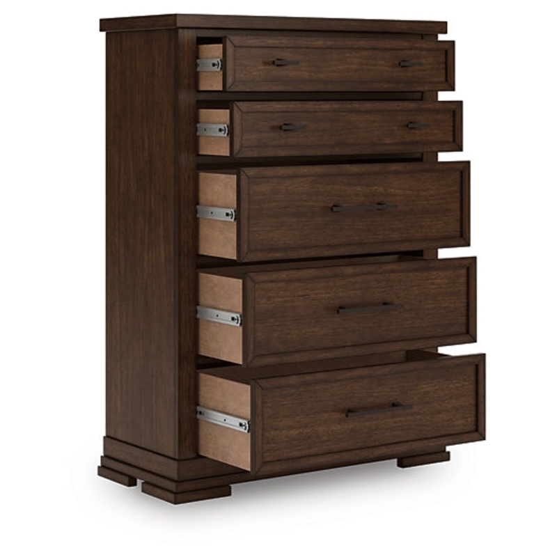 Style, simplicity and charm are hallmarks of this chest of drawers. Created with casual spaces in mind, it has the versatility to suit styles from craftsman to modern farmhouse. The rich brown finish aligns with your refined-meets-relaxed approach to everyday style. And for a timeless touch, five drawers with picture frame detailing accommodate your needs.