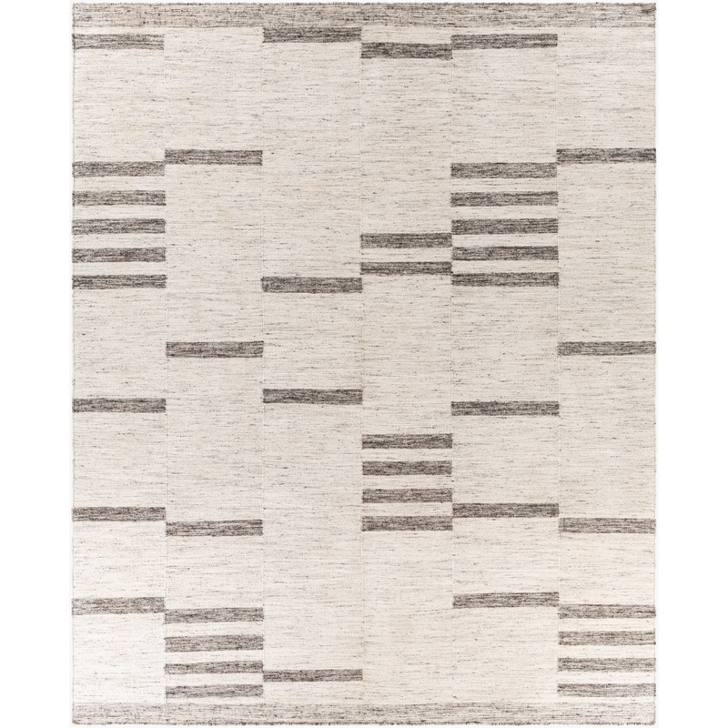 The Tamaris Handmade Rug showcases a no-pile, flatwoven design that delivers a sleek, contemporary look with subtle texture. Its soft yet striking color palette cream, gray, charcoal, and light gray corresponds with TPX codes 11-0604, 16-5803, 18-5210, and