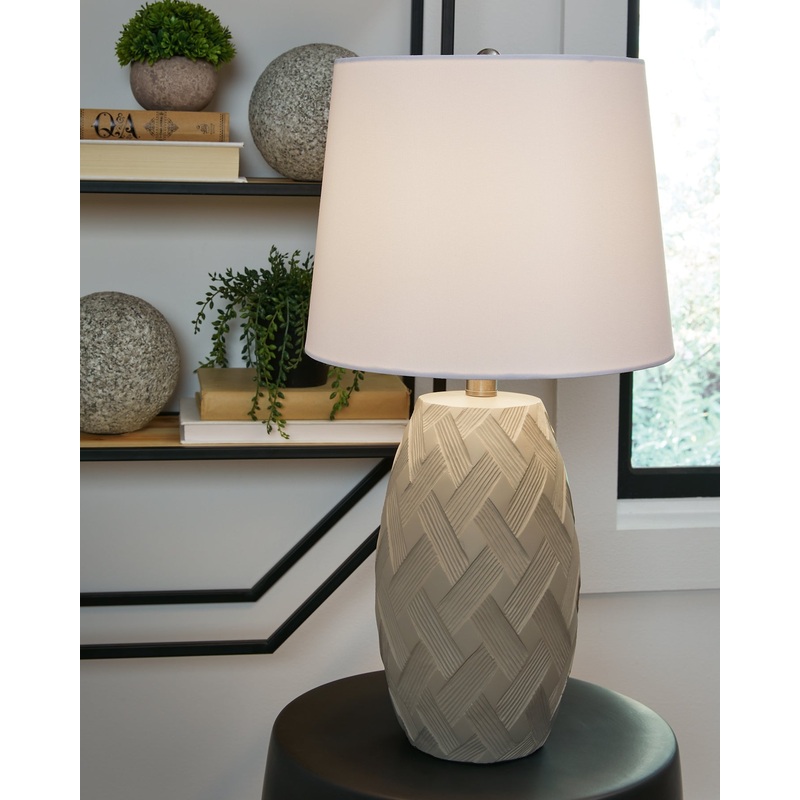 Shine a spotlight on your good taste. With intriguing markings, the Tamner table lamp will be a conversation starter in your living space. Its matte taupe body is topped with a modified drum fabric shade. This unique contemporary lamp will illuminate your decor with style.