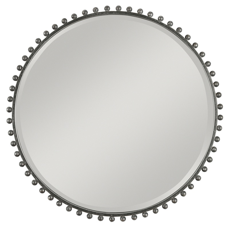 Petite iron spheres line the outer edge of this round frame, finished in a distressed black with silver highlights and a light gray glaze. Mirror features a generous 1 1/4" bevel. Model # (MPN)9691Product ID177418975Manufactured ByUttermostSold ByHouzzSize