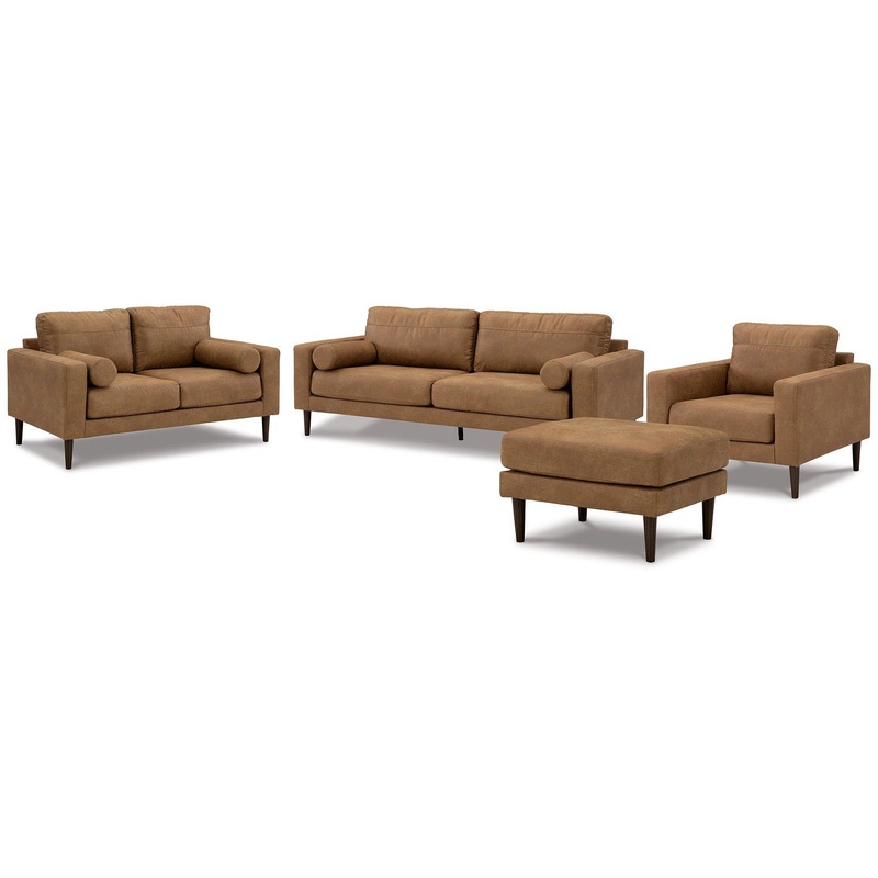 Small-scale style, tailored to perfection. This seating package echoes retro aesthetics with warm caramel faux leather, while its ultra-linear silhouettes incorporate a contemporary edge. Versatile in form and function, this set suits styles from modern bo