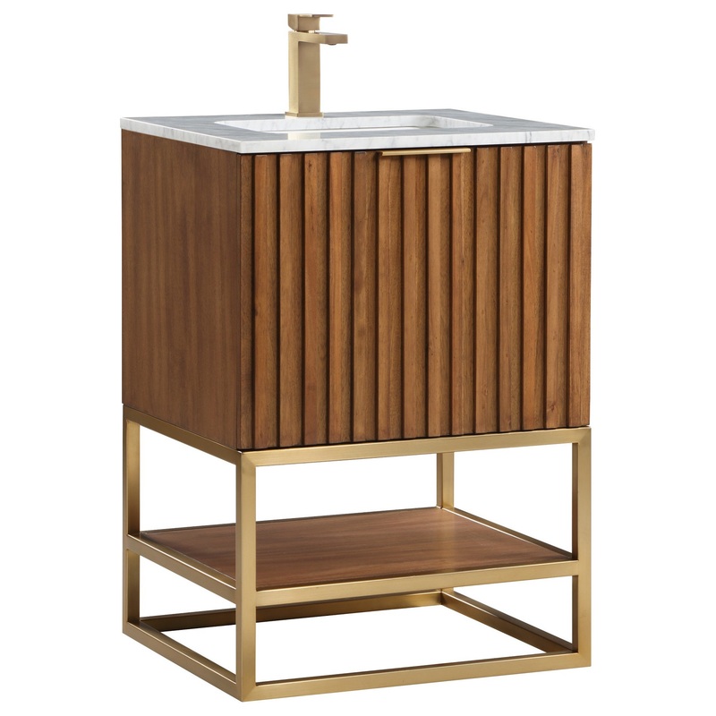 Terra’s uniquely fluted design facade in Walnut or Cashmere Grey veneer will add a sleek and bold look to any bathroom. The architectural metal frame is carefully fashioned in Satin Brass, Matte Black, or Brushed Nickel. Floor models are designed with a handsome, durable and functional integrated storage shelf. The vanity’s deep soft-close and interior pullout drawers are complimented with a matching finish allowing for an easy-to-clean environment. Premium Blum glides deliver an effortless motion while the dovetailed joints provide seamless joinery. Choose between a smooth Italian Carrara marble or a Pure White Quartz top to complete the unified look. (Faucet not included)
