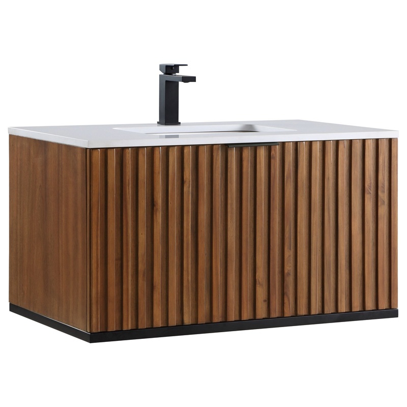 Terra's uniquely fluted design facade in Walnut or Cashmere Grey veneer will add a sleek and bold look to any bathroom. The architectural metal frame is carefully fashioned in Satin Brass, Matte Black, or Brushed Nickel. Floor models are designed with a ha