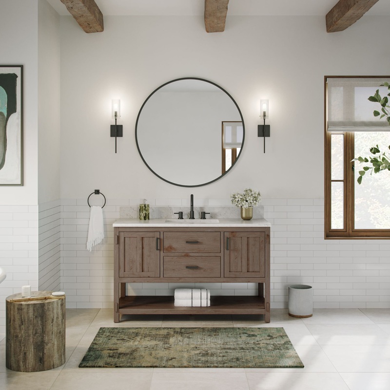 The Betsy Bathroom Vanity was inspired by Modern Rustic Farmhouse design with sleek clean lines and cozy country aesthetics. Premium quality construction with skillfully handcrafted finish. Features Black Metal hardware, dovetail joints, soft-closing drawe