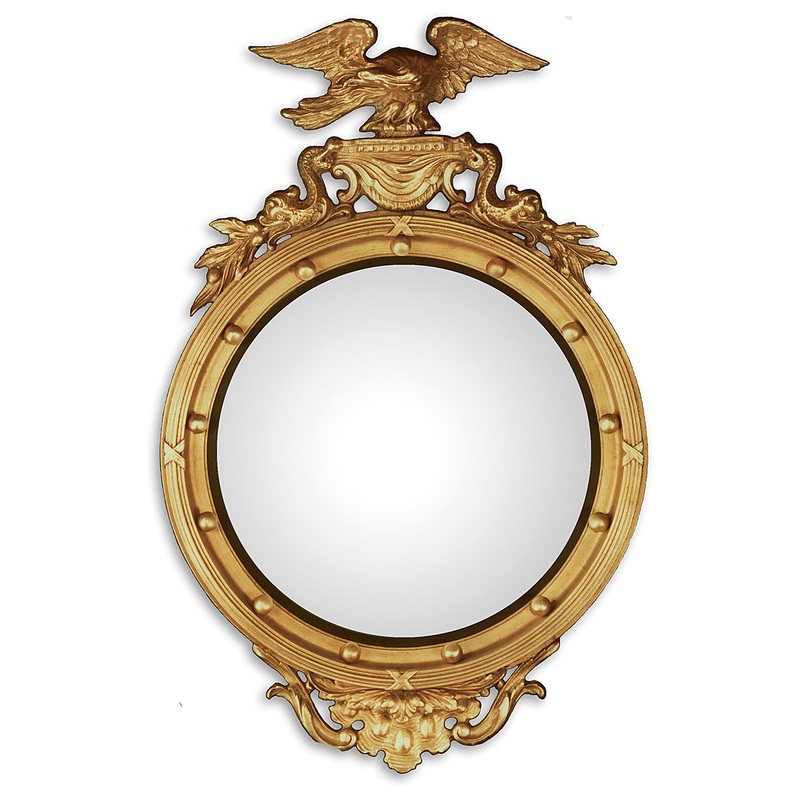 -Late XVIII century Bulls Eye mirror, featuring an eagle with spread wings atop unfurled banner and supported by symbolic dolphins.