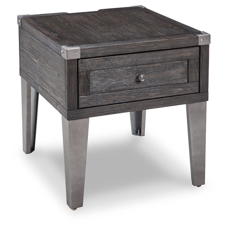 Take a stance for rustic-industrial style with this mixed material end table. Weather-washed pine wood and veneers are contrasted with canted metal legs and corner bracket accents for a uniquely chic merger of earthy beauty and contemporary flair. Power plug-ins and USB charging ports mounted on the back add practical function to great form.