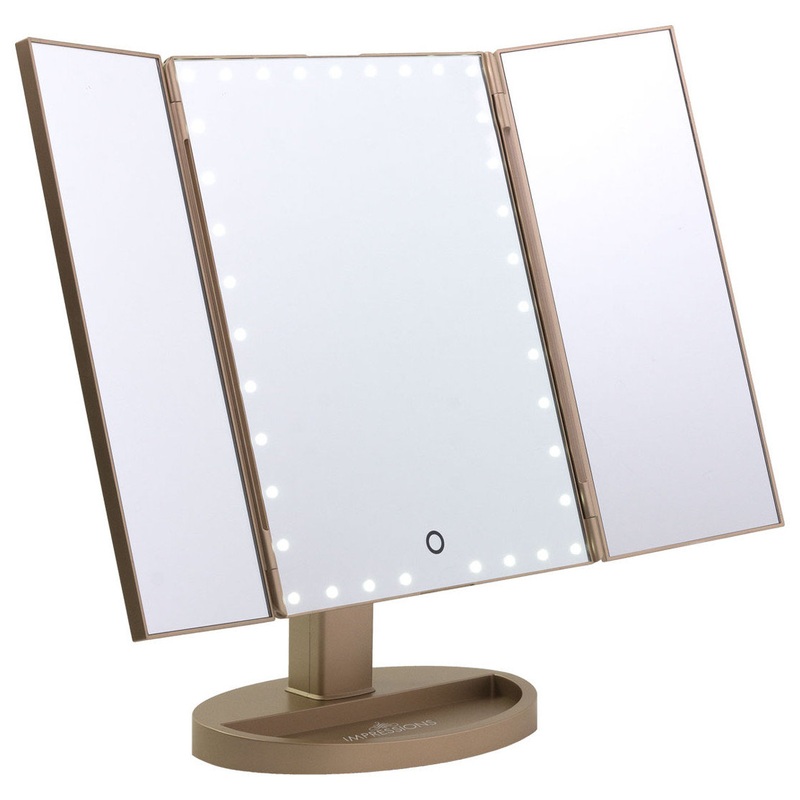 Impressions Vanity touch trifold XL LED makeup mirror elevate your artistry to a whole new level. This mirror has a built-in bright LED strip light. Hold the top touch sensor in the mirror with lights to turn the mirror on / off and adjust the brightness.