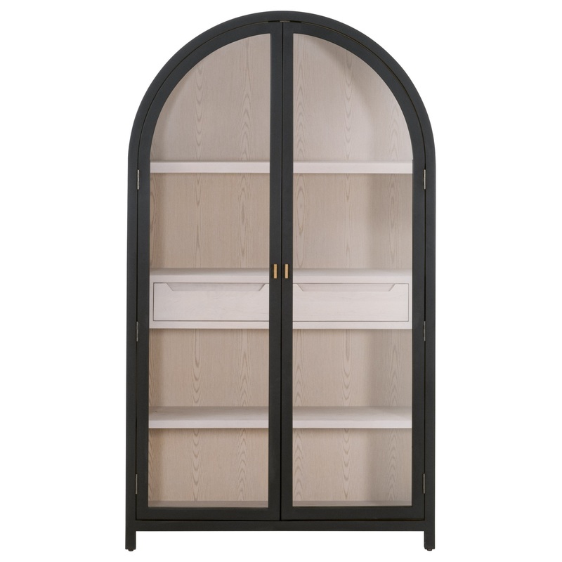 The Toulouse Display Cabinet by Essentials For Living offers a striking blend of style and functionality for your home. Crafted from solid birch wood with a natural oak veneer interior, this transitional piece boasts an arched black birch frame finish that