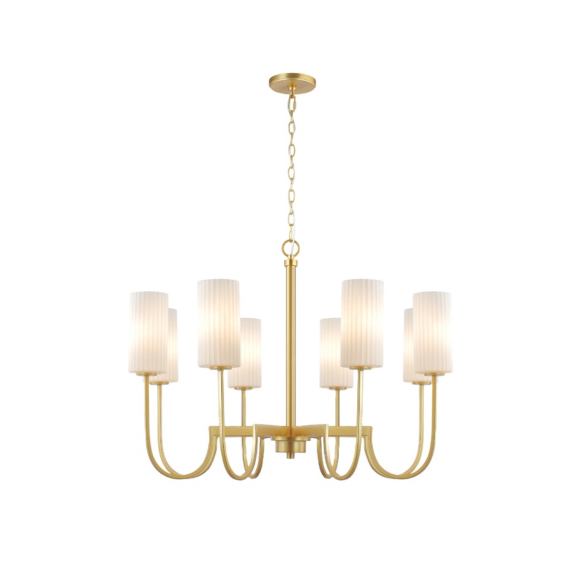 Whether in town or countryside, this collection of chandeliers simplifies the classic curved frame with a modern approach. Finished in your choice of Satin Brass or Matte Black, the sharply curved arms extend higher than classic proportions and support ribbed cylinders of opal white glass shades. These Satin White glasses upgrade pleated shades by form of their ribbed details. This material change adds durability for cleaning and maintenance.