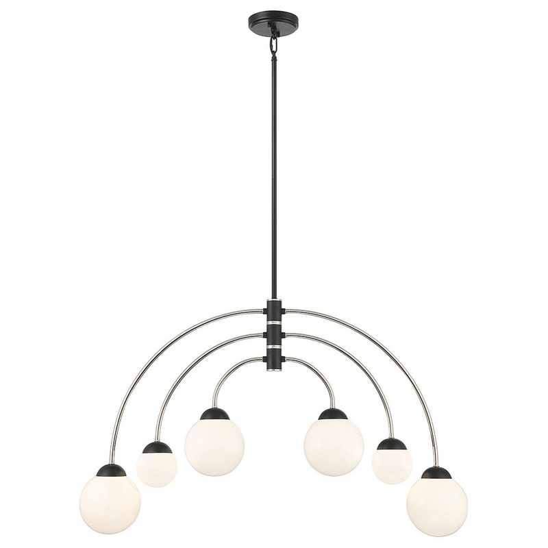 This 6-light chandelier offers up a fashionable vintage-inspired look for today's homes! It flaunts a chic two-tone finish of Matte Black with Polished Nickel and adjustable arms that hold orbs of white opal glass. 22" height and 38" width. Adjustable heig
