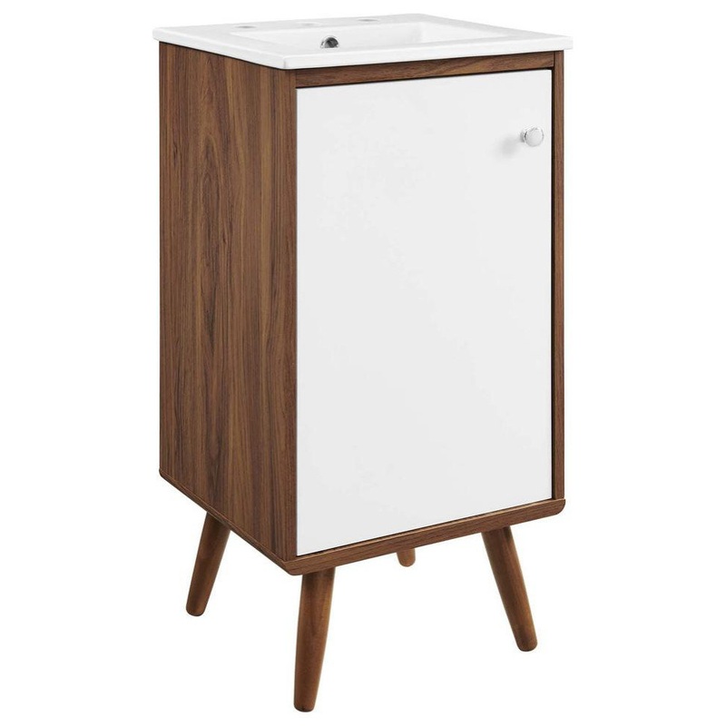 Bring mid-century modern aesthetics into the bathroom with the Transmit 18 Bathroom Vanity. This vanity features a durable particleboard and walnut grain veneer construction with ample storage space for all your bathroom essentials behind a white lacquered soft-close hinged door. A ceramic sink with an integrated countertop, 8 centerset faucet holes, and rectangular sink basin continues the sleek look of this retro modern vanity. Complete with chrome knobs, this bathroom vanity rests atop four splayed wood legs. Assembly required and sink fixtures not included.
