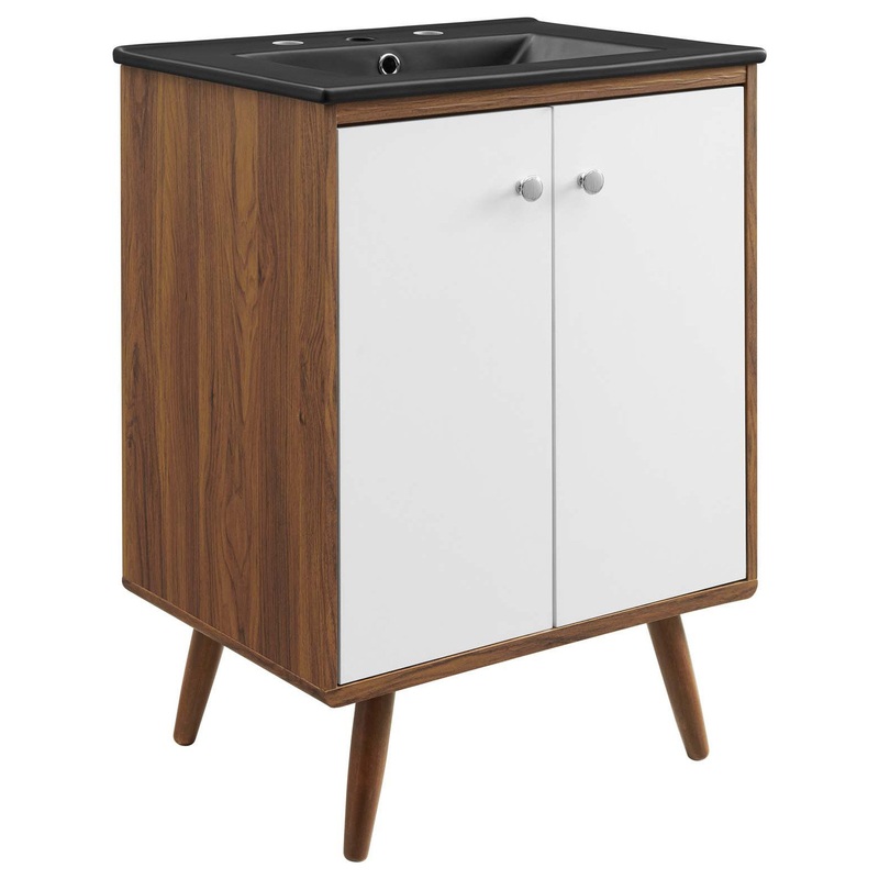 Bring mid-century modern aesthetics into the bathroom with the Transmit 24" Bathroom Vanity. This vanity features a durable particleboard and walnut grain veneer construction with ample storage space for all your bathroom essentials behind two white lacque