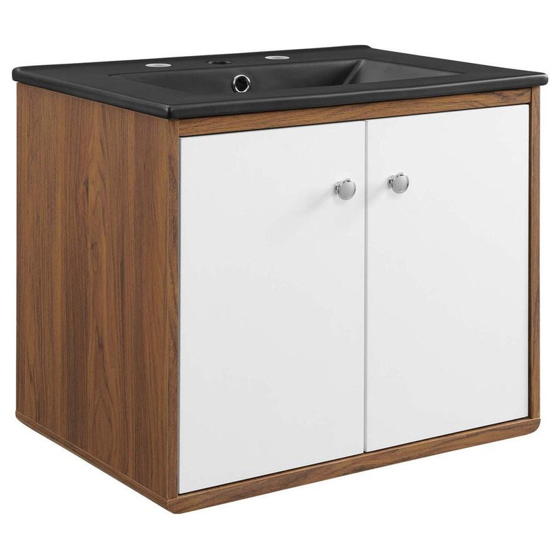 Bring mid-century modern aesthetics into the bathroom with the Transmit 24 Bathroom Vanity. This vanity features a durable particleboard and walnut grain veneer construction with ample storage space for all your bathroom essentials behind two white lacquered soft-close hinged doors. A ceramic sink with an integrated countertop, 8 centerset faucet holes, and rectangular sink basin continues the sleek look of this retro modern vanity. Complete with chrome knobs, this bathroom vanity mounts directly to the wall saving a substantial amount of floor space. Assembly required and sink fixtures not included.