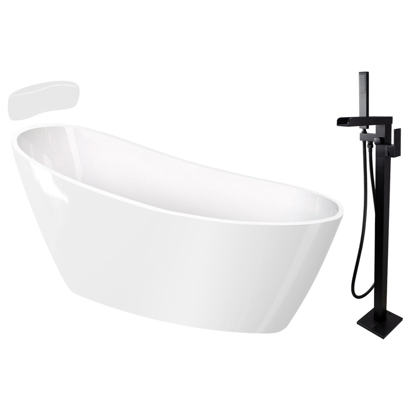 -KIT INCLUDES: Freestanding acrylic bathtub, tub filler faucet with hand shower, self-adhering bath pillow, pop-up drain, and built-in overflow