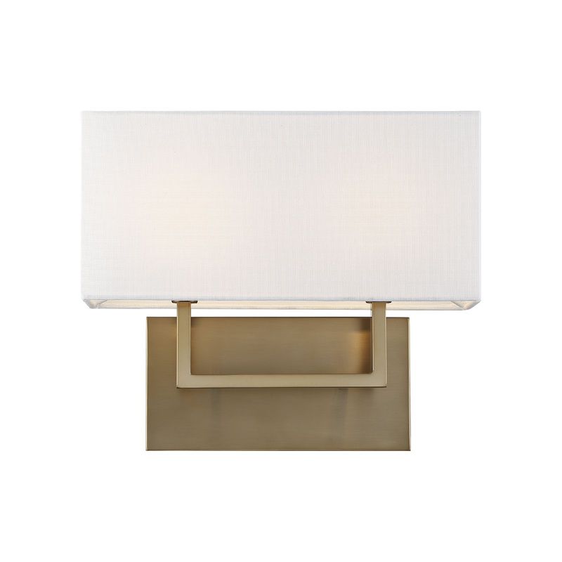 Satco's 60-6717 Tribeca wall sconce features slender and squared double arms that support a hard cornered rectangular white linen shade, sculpted in design and emphasized by the rectangular back plate finished in burnished brass. Precision and grace in the