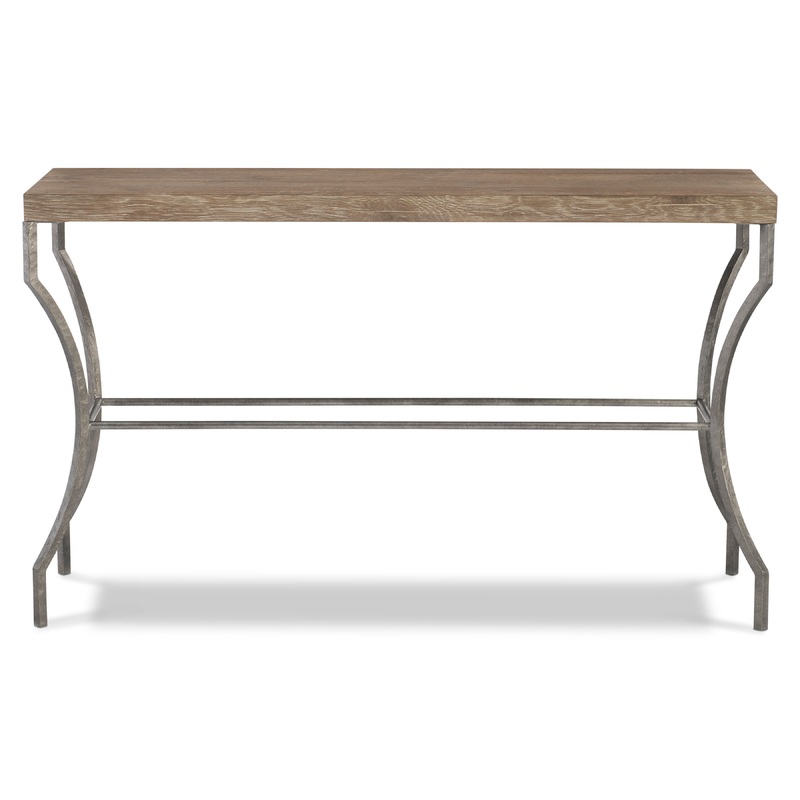 A wire-brushed top on the Tribeca console table highlights the natural details of the wood, finished in Aurum. It offers a beautiful counterpoint to shapely steel legs connected by stretchers and finished in Barlow.