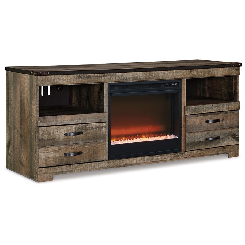This TV stand with fireplace option makes home on the range look so alluring. The aesthetic is earthy yet clean and sophisticated, with a rustic finish, plank-style details and nailhead trim that pay homage to reclaimed barn wood. Adding that much more warmth, the LED fireplace insert operates with or without heat and includes a six-level temperature setting, a remote control and an overheating control for added safety. It comes with faux glass crystals and natural stones, so you can customize the look of the flame bed.