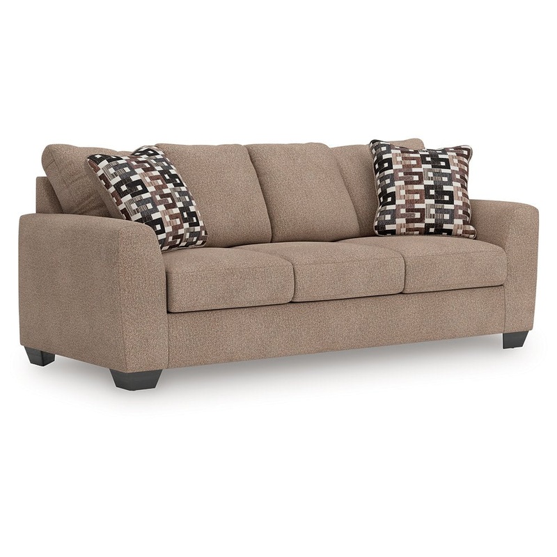 Transitional and right on trend. This sofas upholstery is a delightful change from the ordinary, with hints of soft brown giving the gray hue added depth. Its punctuated with chic accent pillows in an eye-catching, stylized stripe design. Whether you’re hosting friends and family or relaxing solo, this sofa invites homey, comfortable character into your space.